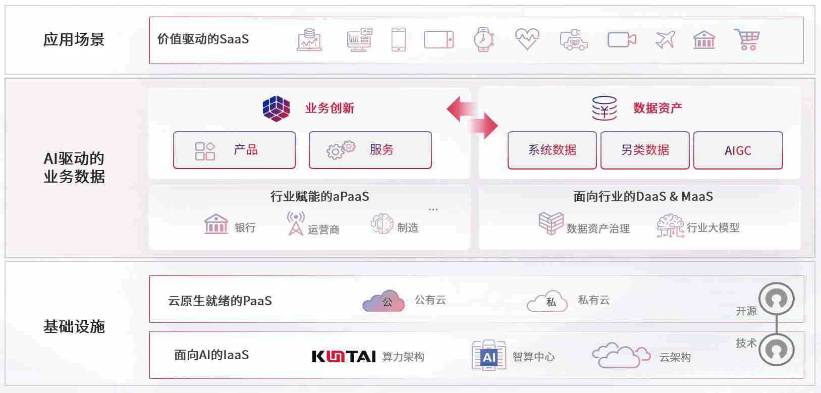 数字时代,,,,围绕企业数字化转型的关键要素,,,,彩神vll数码开创性的提出数云融合战略和技术体系框架,,,,着力在云原生、、数字原生、、、AI原生和信创产业上架构产品和服务能力,,,,为处在不同数字化转型阶段的快消零售、、、、汽车、、、、金融、、医疗、、政企、、、、教育、、、运营商等行业客户提供泛在的敏捷IT能力和融合的数据驱动能力,,构建跨界融合创新的数字业务场景和新业务模式,,,,助力企业级客户建立面向未来的核心能力和竞争优势,,,,全面推动社会的数字化、、智能化转型升级。。