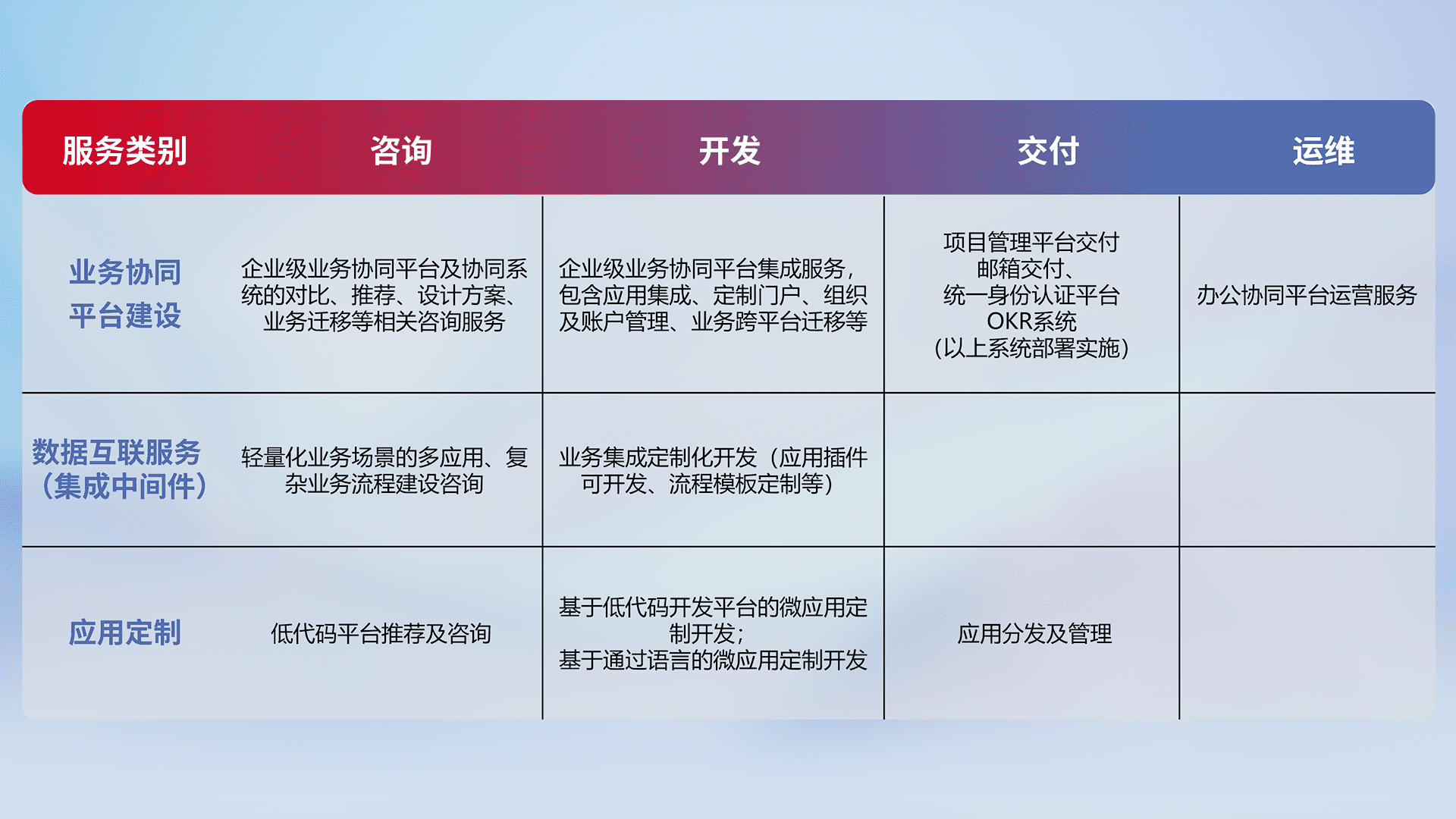 针对钉钉、、、、企微、、、IDaas等平台级产品提供产品的规划、、、、方案、、交付、、、定制化开发等服务,,实现如统一协同办公、、智能客户服务、、、混合会议管理、、智能数据查询、、、等业务场景,,,实现数字化转型。。
