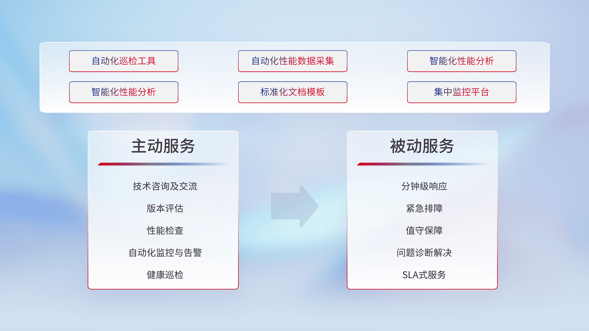 智能化工具和标准化文档,,,,保障服务质量,,提供主动服务(包含技术咨询、、版本评估、、性能检查、、自动化监控与告警、、健康巡检)和被动服务包含(分钟级响应、、、紧急排障、、值守保障、、、、问题诊断解决、、、、SLA服务)。。